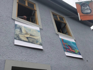 Ausgewählte Friedenstauben sind nun auf Planen gedruckt und werden heute und morgen an die Fassade der Weimarer Mal- und Zeichenschule gehängt.